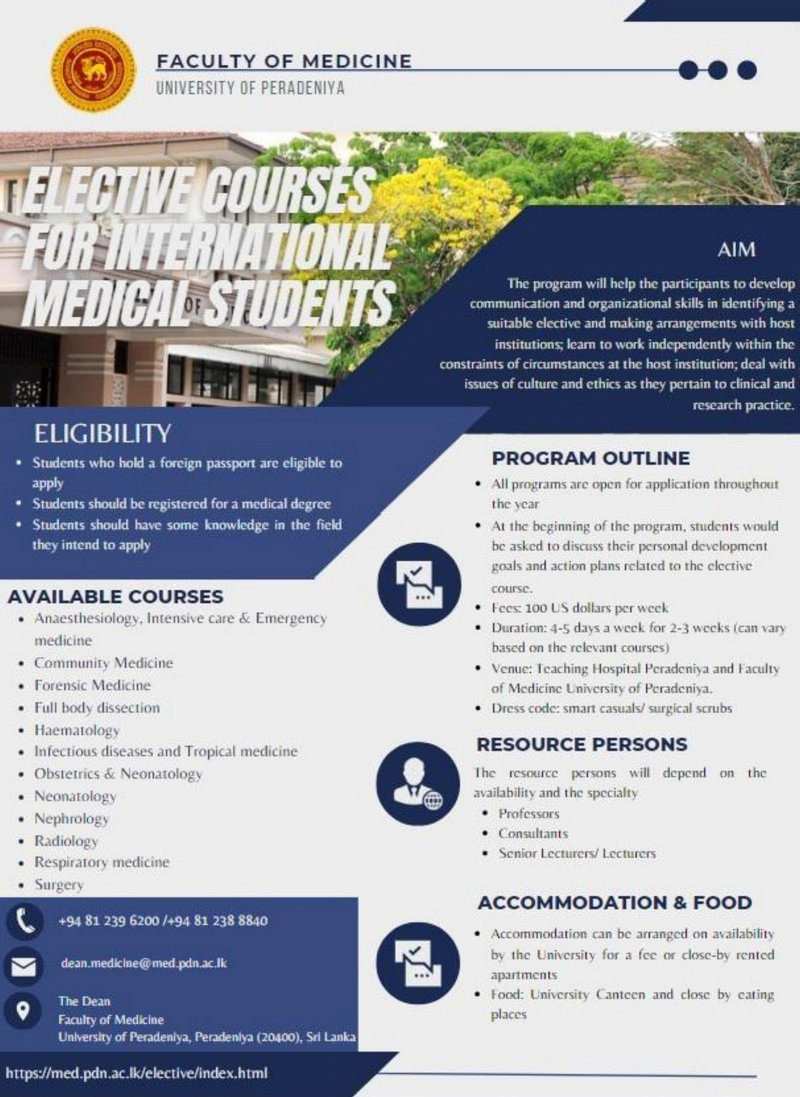 Medical School Peradeniya has a long tradition accommodating elective students from all over the world is now ready to continue in the post COVID era. Please browse the Flyer for the variety of programmes available.