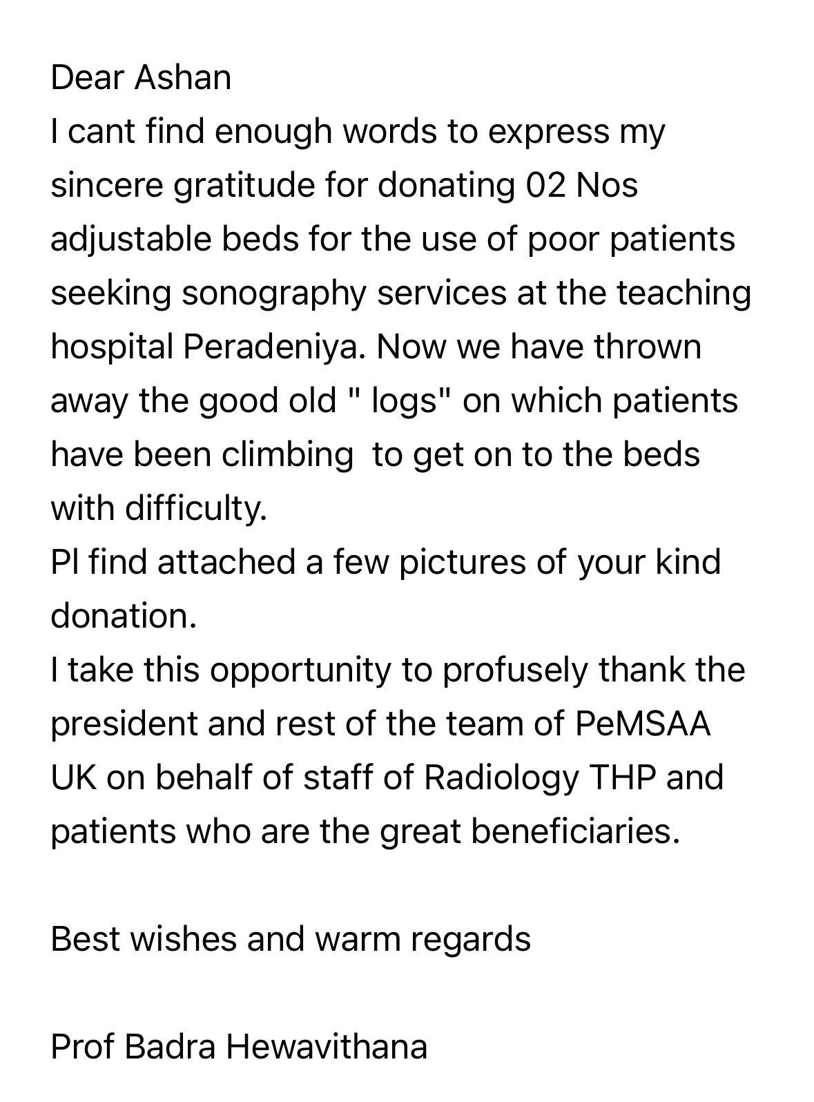 PeMAA-UK recently donated two scanning beds to the Teaching Hospital, Peradeniya. The donation was warmly received by Prof. Badra Hewavitharana. This project was made possible through the generous contribution coordinated by Prof. Dayananda Samarawickrama and Padma Samarawickrama.